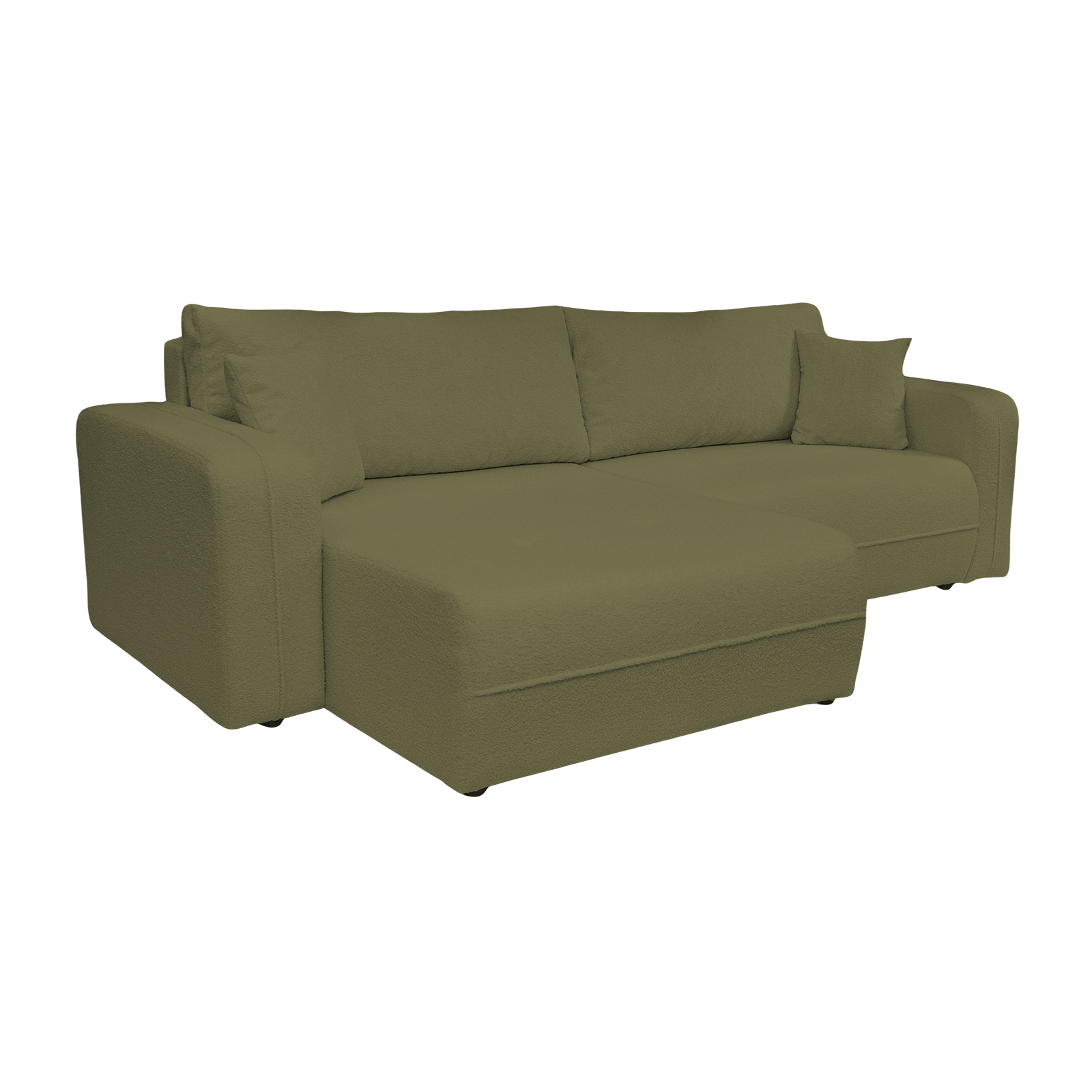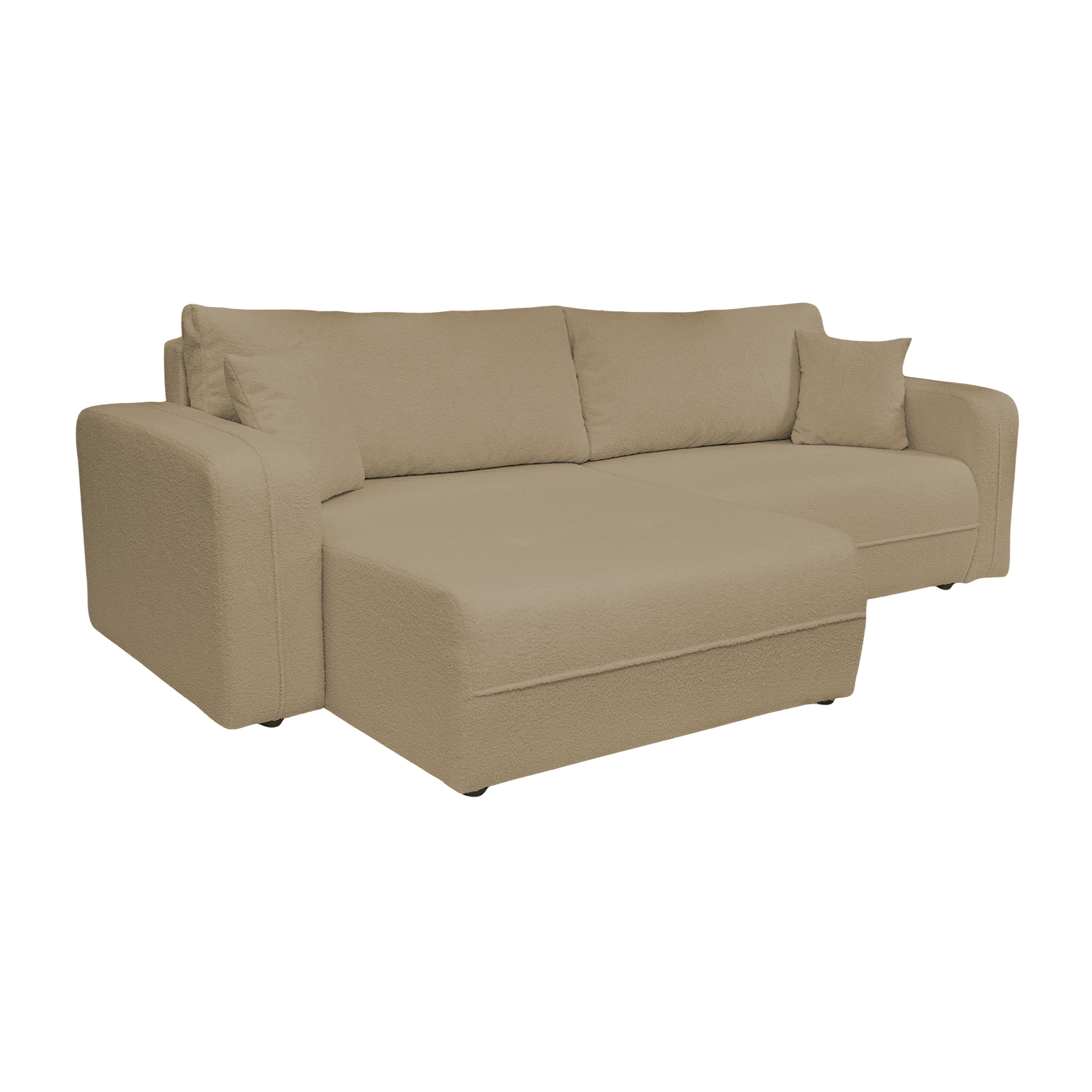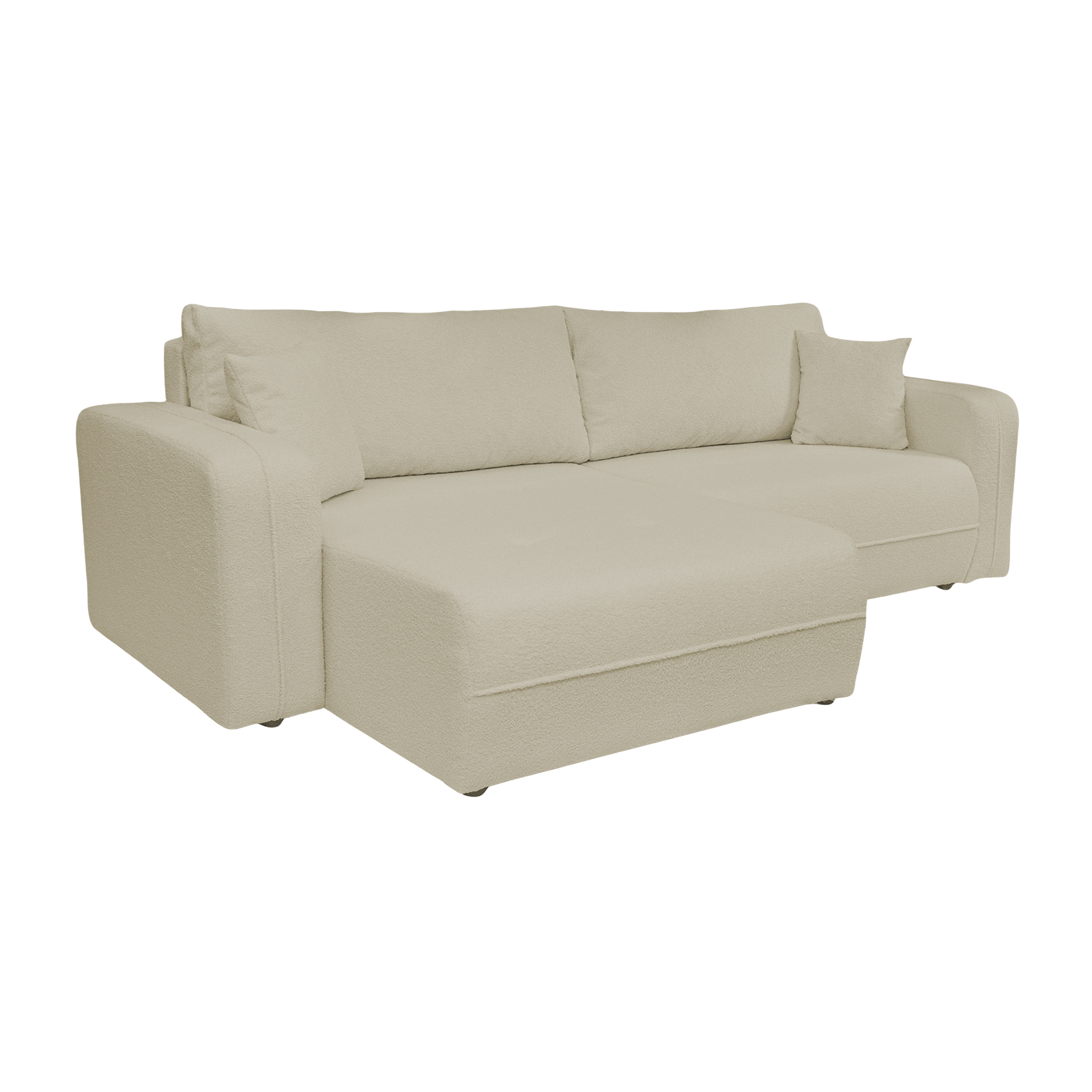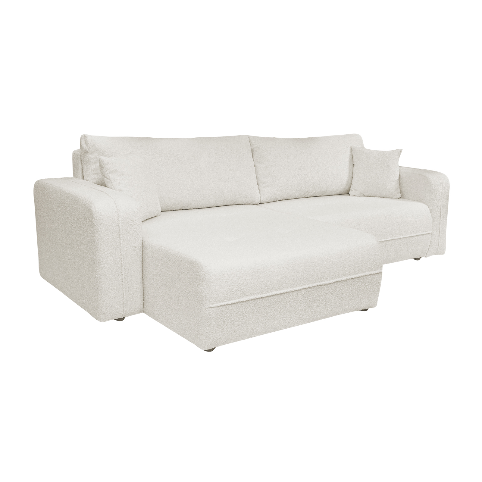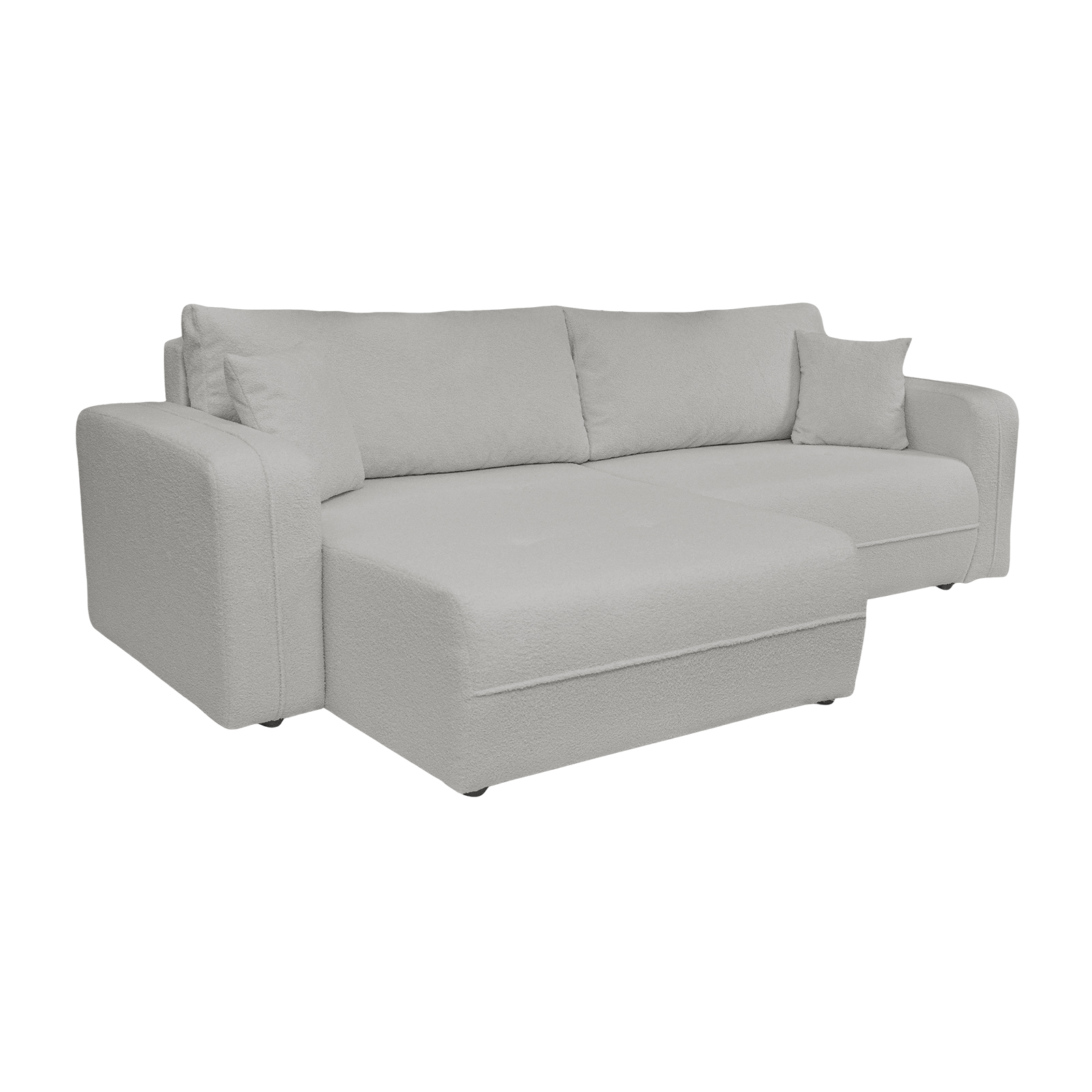 Narożnik Oreo to stylowe i funkcjonalne rozwiązanie dla tych, którzy cenią nowoczesny design oraz codzienną wygodę. Jego minimalistyczna forma wnosi świeżość do wnętrza, a miękki w dotyku materiał Quelle Bouclé (efekt owczej wełny) dodaje przytulności i unikalnego charakteru. Narożnik Oreo w kształcie litery L został zaprojektowany z myślą o codziennym komforcie – przestronna część wypoczynkowa zachęca do relaksu, a dzięki funkcji spania w kilka chwil zamienia się w wygodne łóżko. Dodatkowy pojemnik na pościel pozwala zachować porządek i optymalnie wykorzystać przestrzeń.